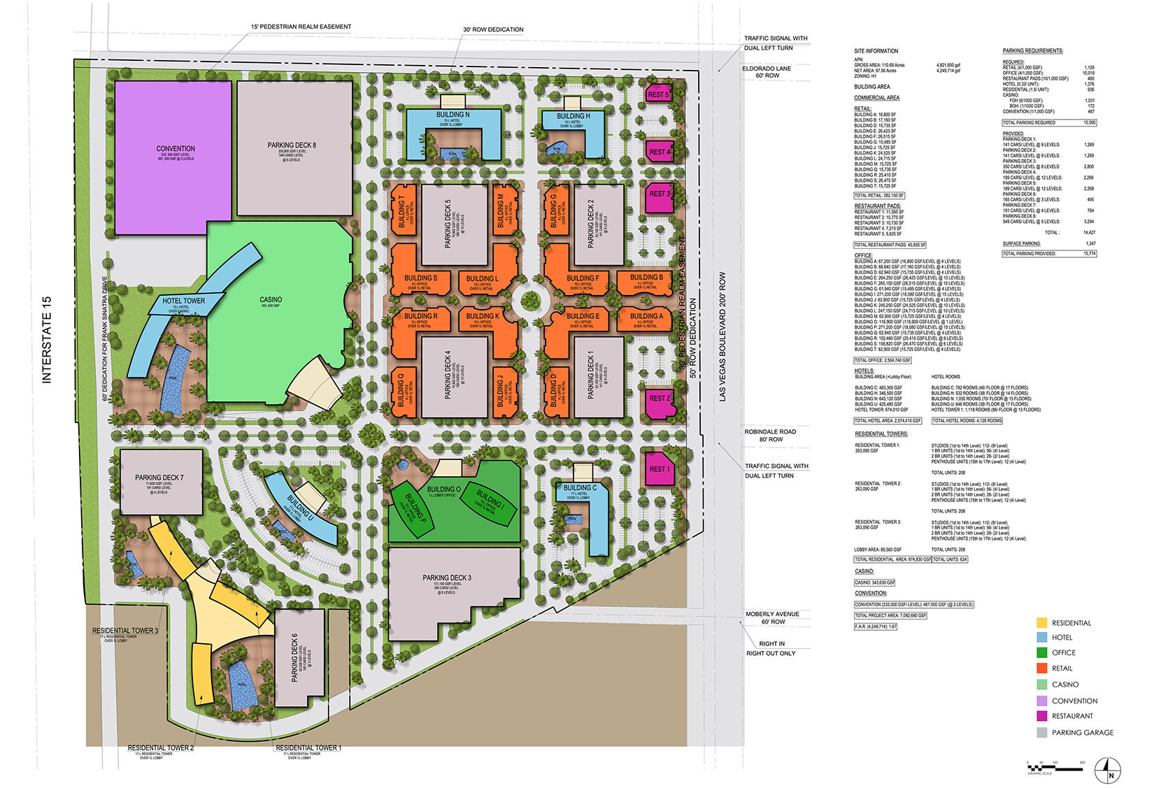 110 Acres Mixed-Use development on south Las Vegas boulevard comprising of 282,000 SF of retail, 45,000 SF of Restaurant Pads, 2,500,000 SF of Office Space,4,128 Hotel Keys,624 Residential Units, a 340,000 SF casino, and 467,000 SF Convention Center, along with 15,774 Parking Spaces