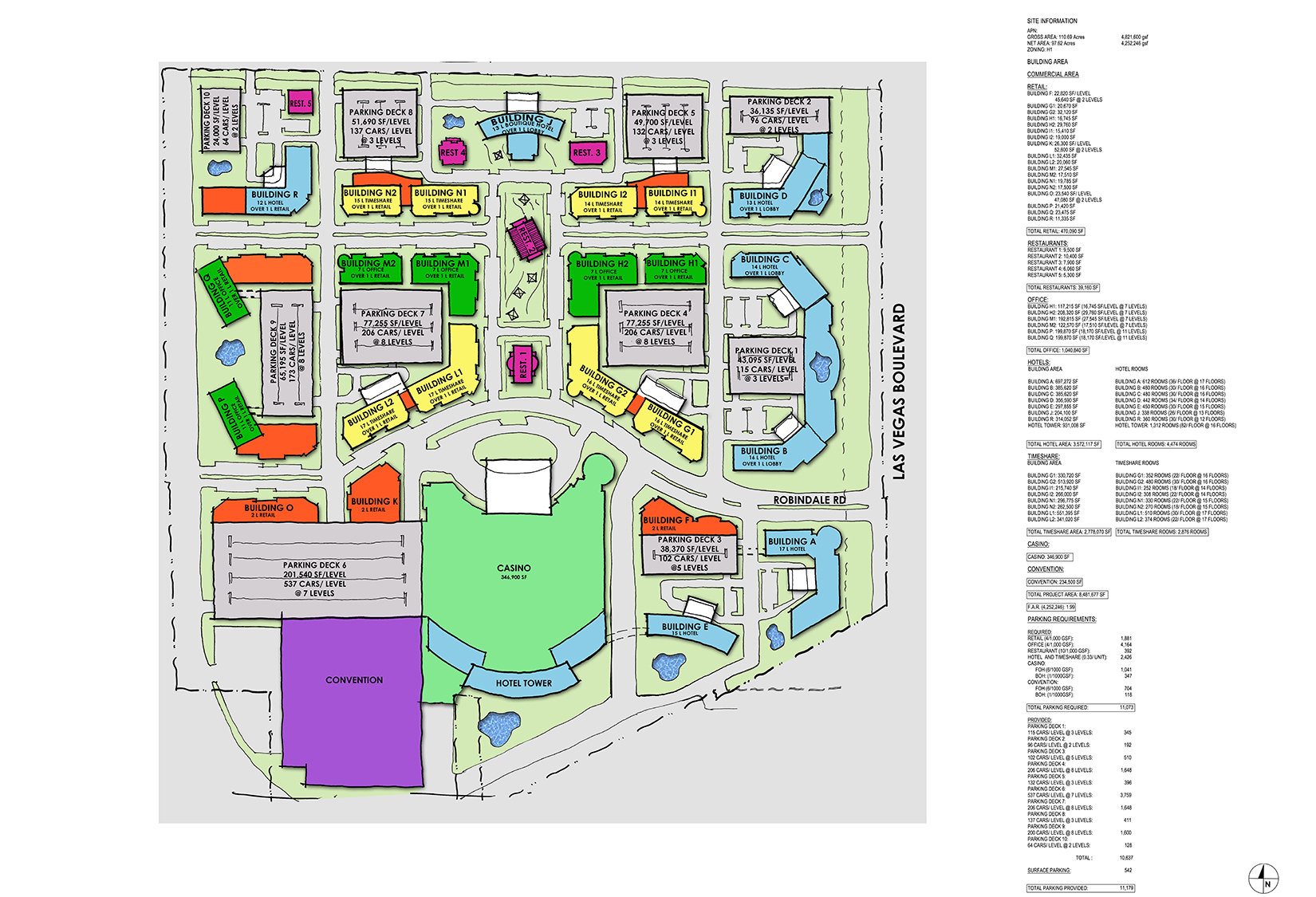 110 Acres Mixed-Use development on south Las Vegas boulevard comprising of 470,000 SF of retail, 39,500 SF of Restaurant Pads, 1,040,840 SF of Office Space,4,474 Hotel Keys, 2,876 Timeshare rooms, a 346,900 SF casino, and 234,500 SF Convention Center, along with 11,179 Parking Spaces